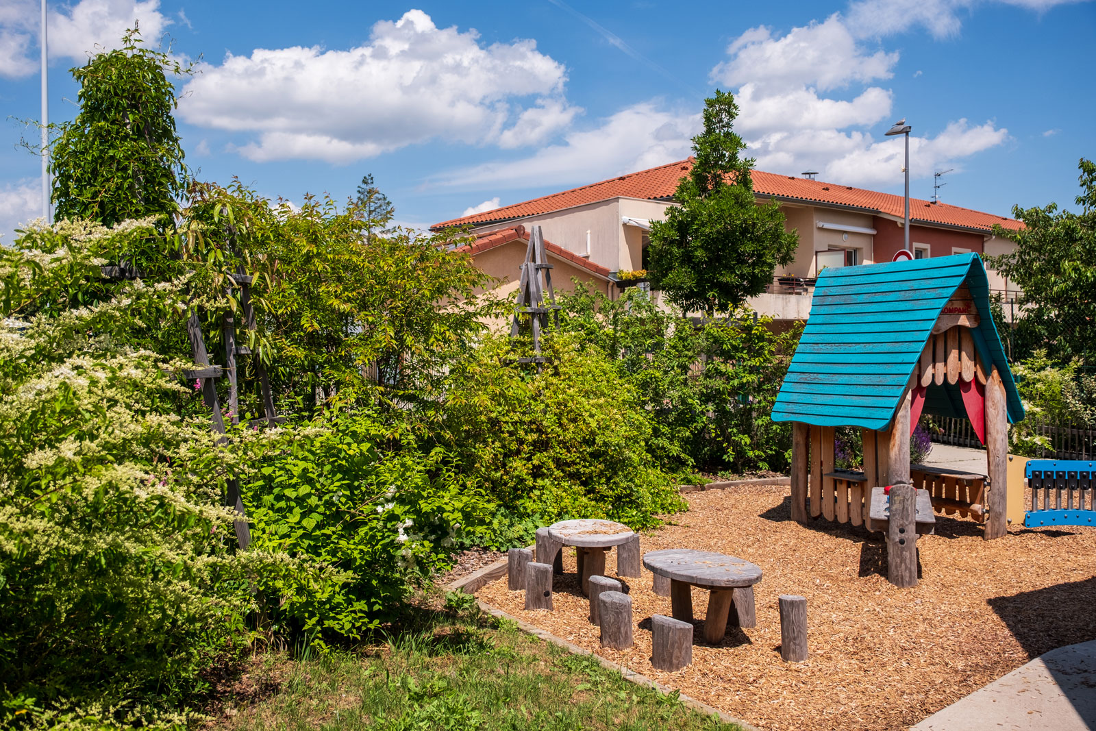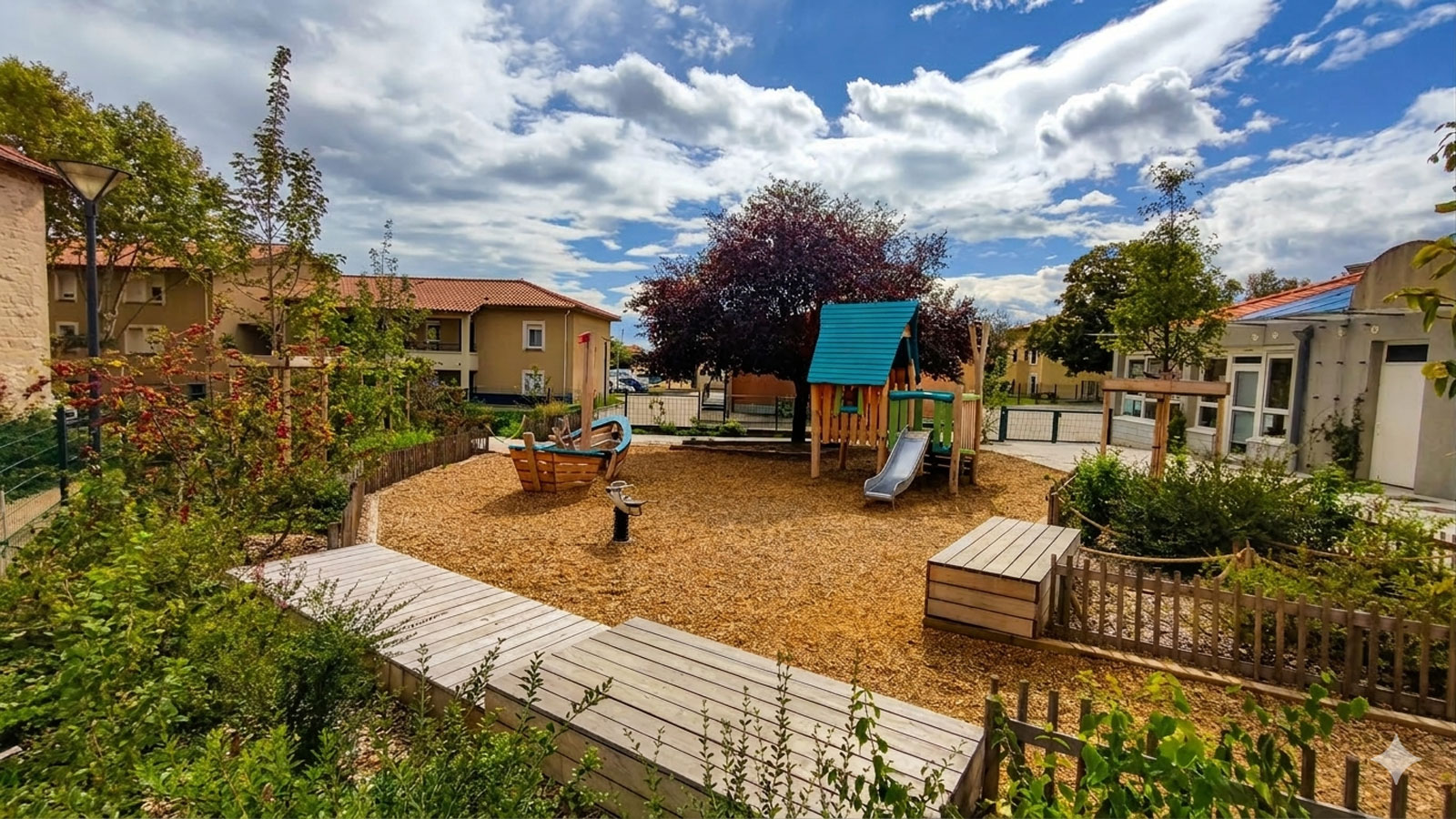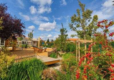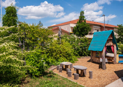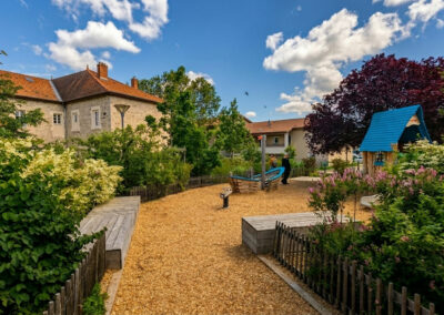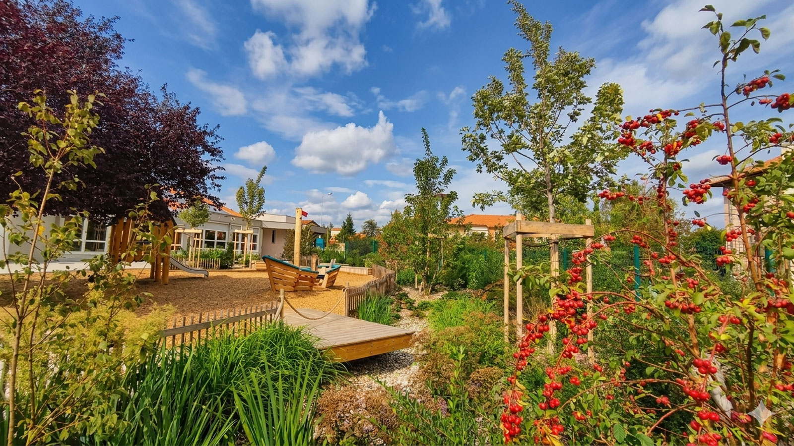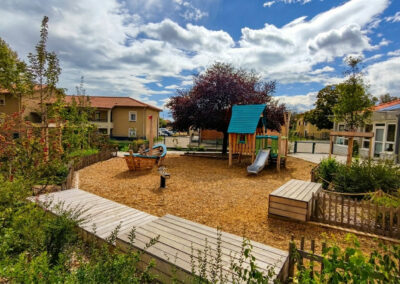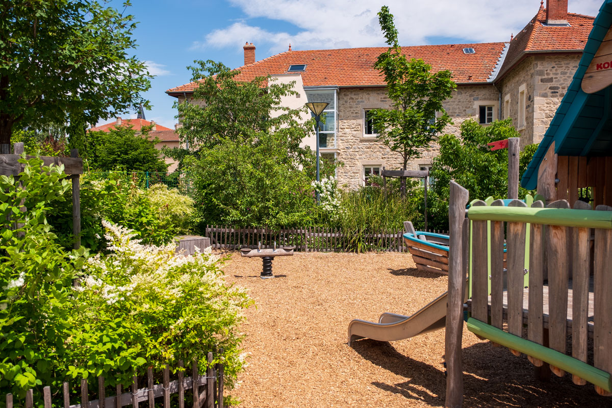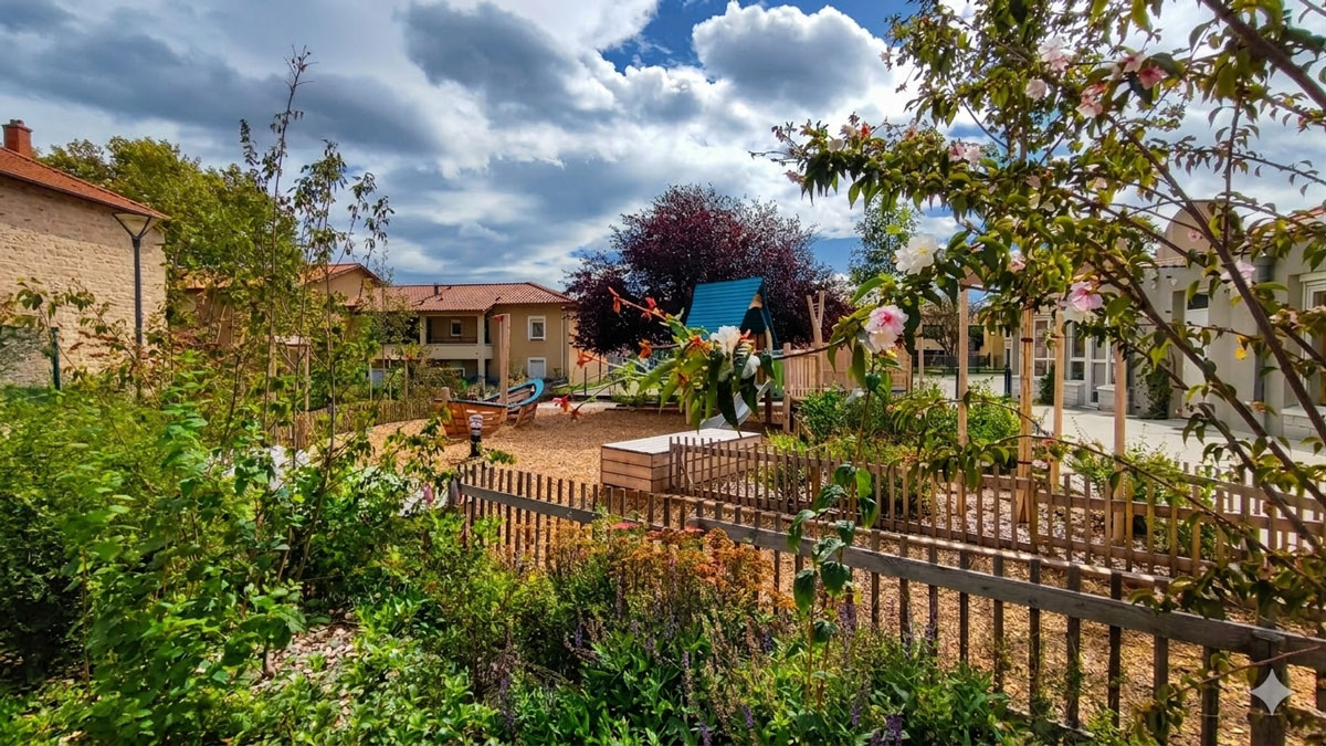 La valorisation des ressources naturelles (le bois, l’eau …), l’introduction du végétal et la desimperméabilisation des sols sont des objectifs fort du programme qui doit participer au confort d’accueil des enfants.