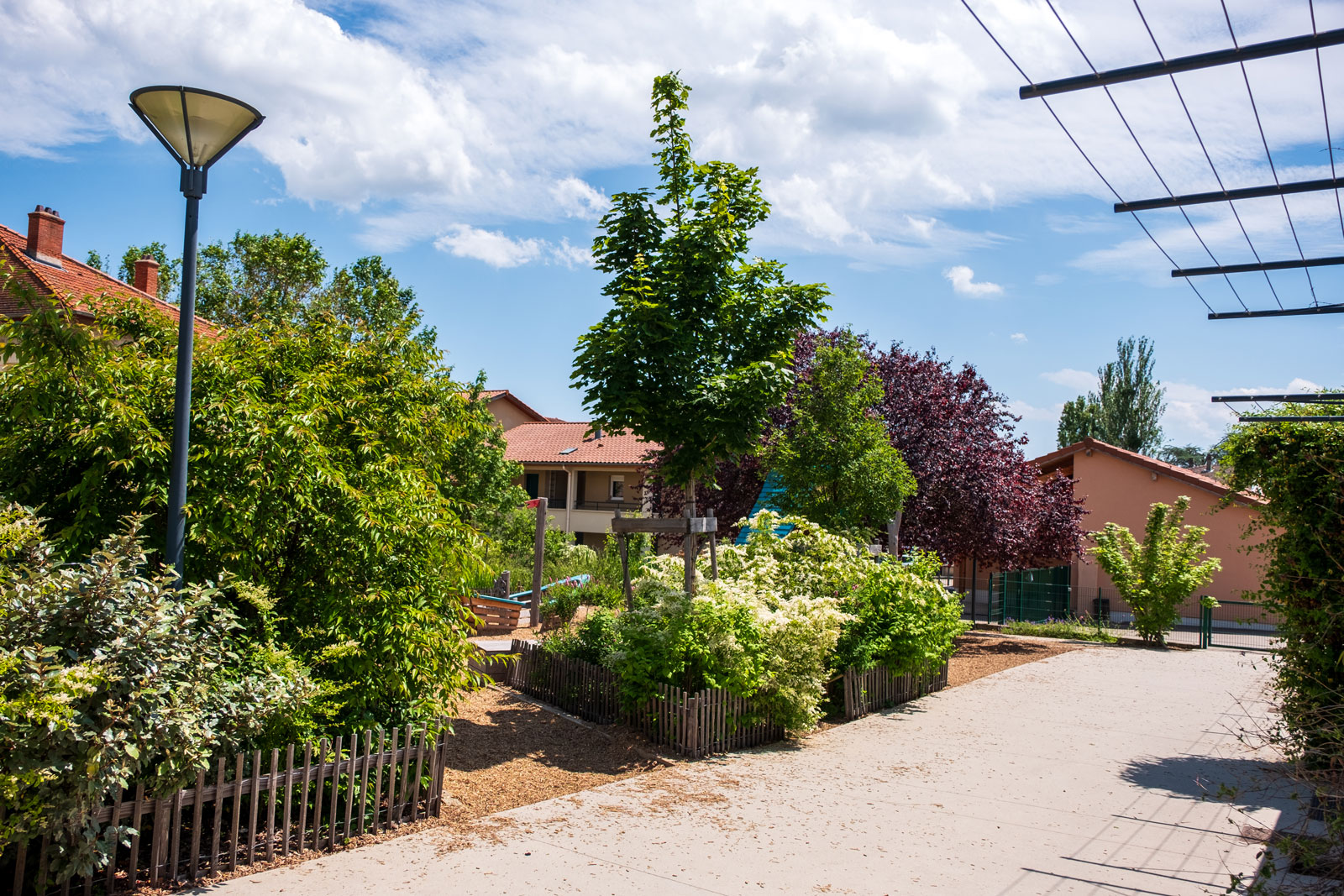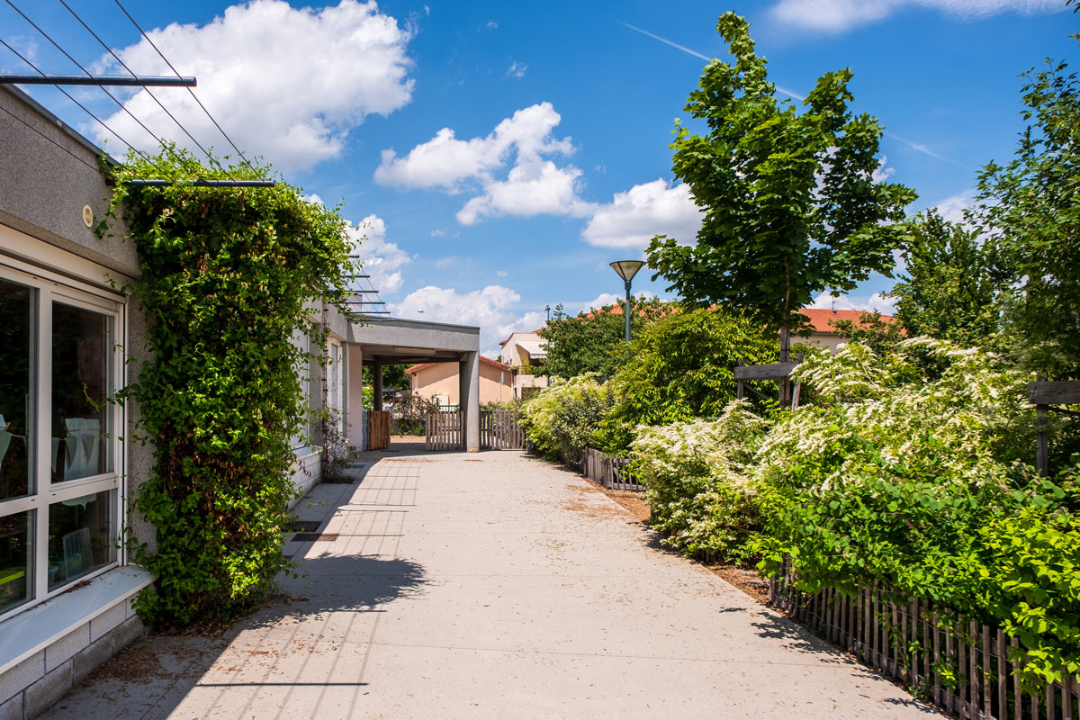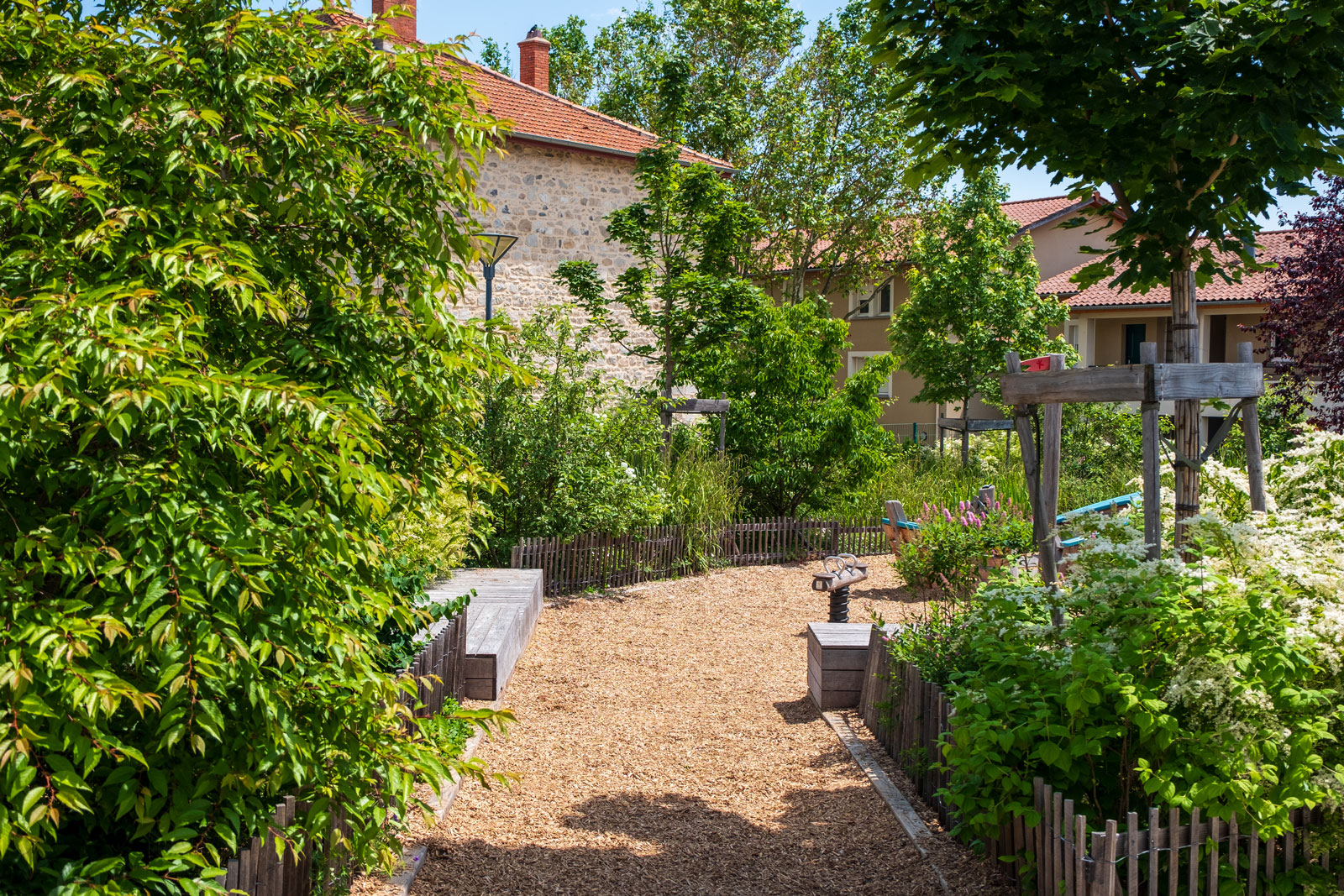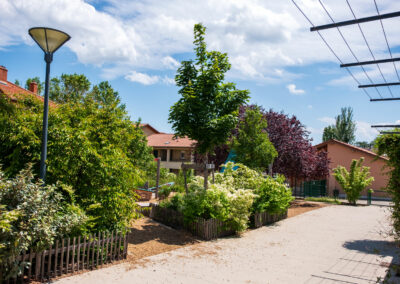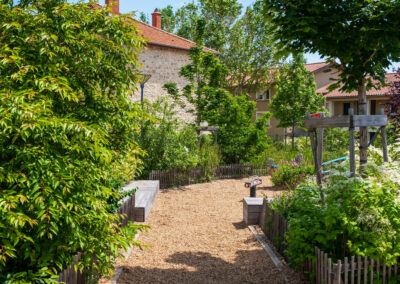 Dans la grande cour, le sol a été desimperméabilisé, un couvert arboré et arbustif a permis d’apporter de l’ombre et de différencier les espaces. Les lisières en limite de la cour sont épaissies et accueillent une vrai diversité floristique dont un jardin de pluie (noue de stockage des EP, planté de vivaces et arbustes).