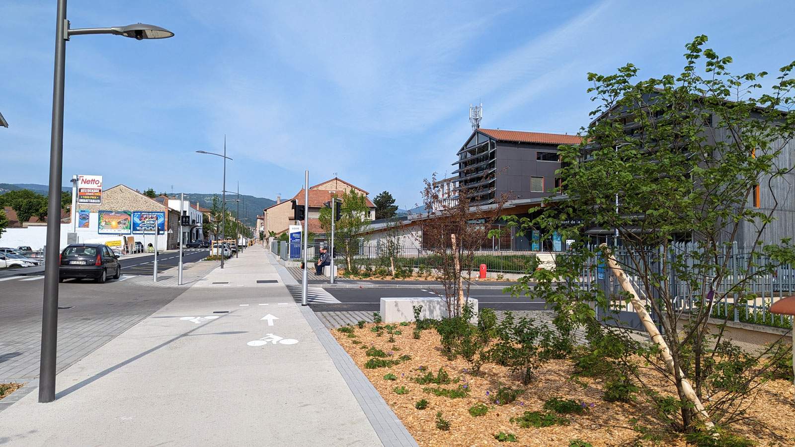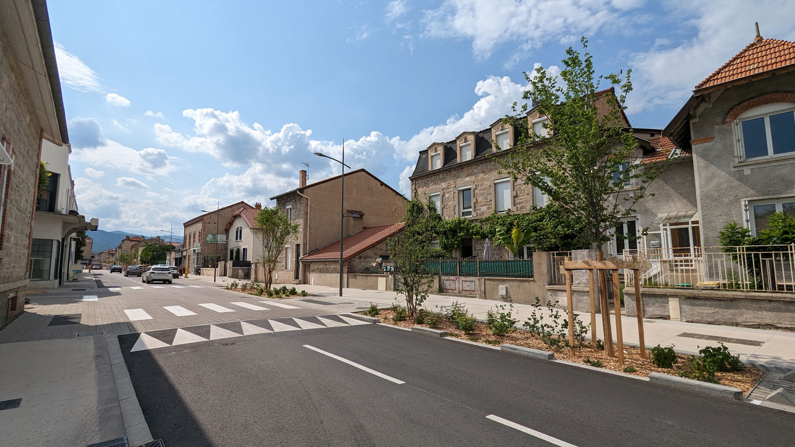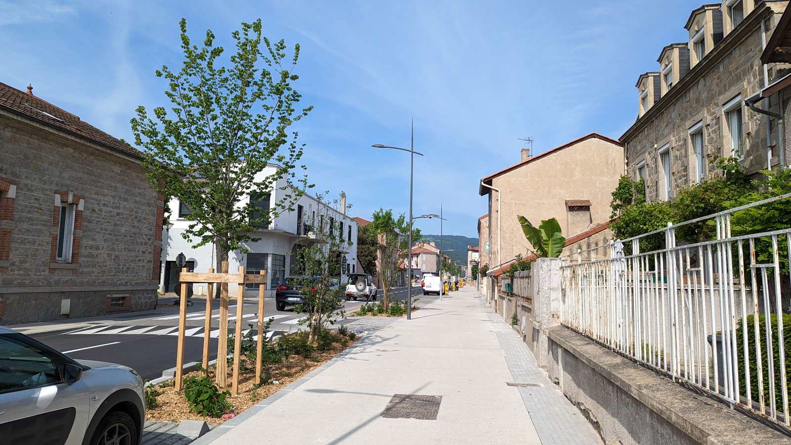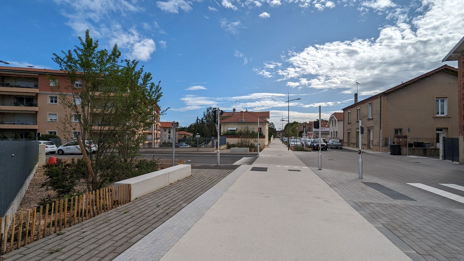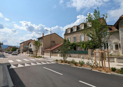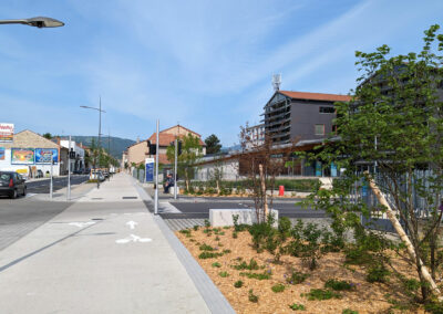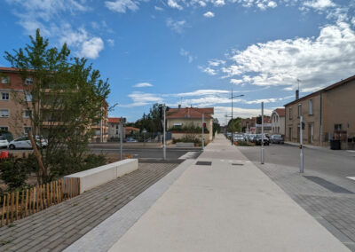 Les enjeux du projet étaient d’apaiser la circulation de cet axe fort et favoriser les usages modes doux, tout en confortant la lecture d’une liaison historique avec la mise en place de ponctuation arborée.