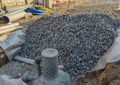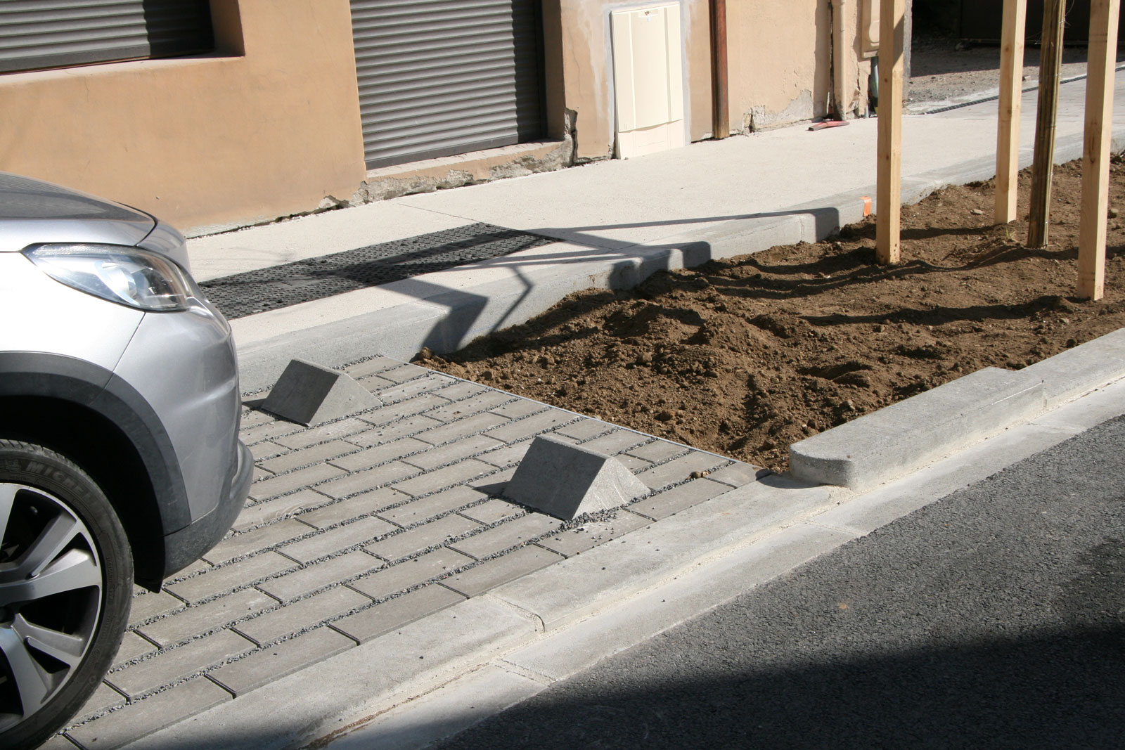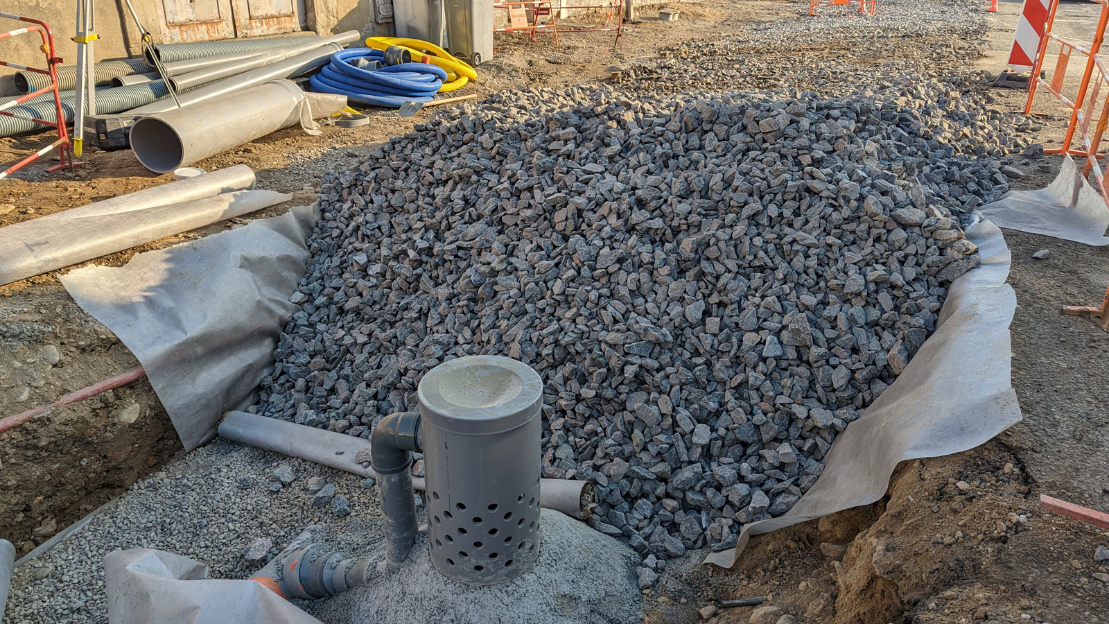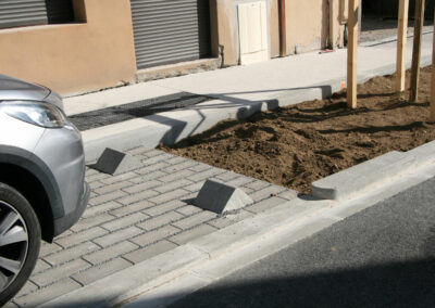 Le projet a permis de requalifier 900ml de voirie et de déconnecter intégralement 430ml de chaussée du réseau d’assainissement (l’infiltration des linéaires restant n’ayant pas été possible du fait de la proximité des habitations et des caves). Pour cela, le projet rejette gravitairement l’ensemble des eaux de ruissellement dans les zones de stationnements et de plantations, sous lesquels une fosse de Stockholm prend place (250m3 de terre-pierre et 700m3 de granulats). Le projet permet ainsi de gérer une pluie trentenale par stockage et infiltration.